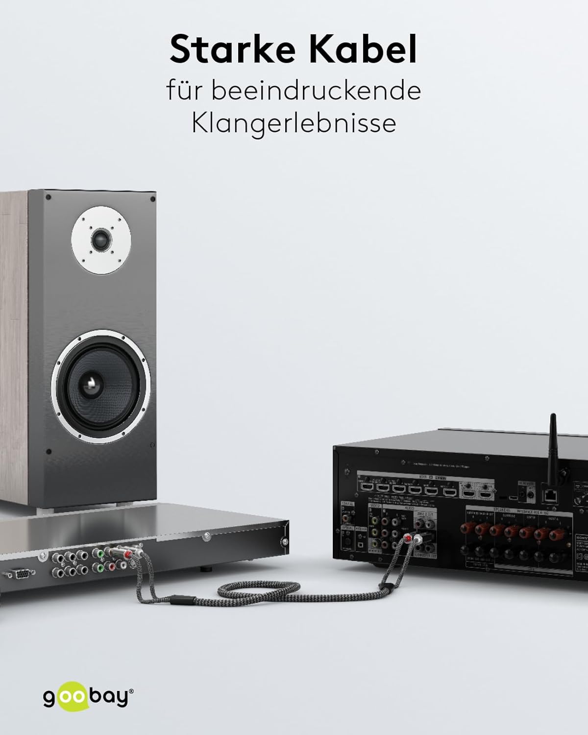 Stereo RCA Cable, 3 m 2 RCA male (audio left/right) > 2 RCA male (audio left/right) The Goobay Plus series comes in a slim, elegant metal design in Sharkskin Grey. The stereo RCA cable is perfect for multiple purposes - whether on a subwoofer, Blu-ray player, mixing console or hi-fi system. The high-quality, robust plugs are also suitable for frequent connecting and disconnecting. Audio cable for connecting a subwoofer, CD player or bass box to output devices such as a receiver, amplifier, mixer or TV set with RCA connections Highly flexible premium RCA cable with slim metal plugs, bend protection and a colour-matched textile cable The braided textile sheath of the subwoofer cable provides a pleasant feel and is gentle on sensitive surfaces The standard colour coding of the RCA plugs in red and white simplifies the connection process The gold-plated RCA plugs prevent corrosion and are especially durable With a length of 3 m, the cable is particularly suitable for cabling home cinema systems Technical specifications Connections Connection, contact material Gold-plated Connection, housing material Aluminium Connection type RCA Female Connection, type 2 RCA male (audio left/right) Connection 2, type 2 RCA male (audio left/right) Cable Cable sheath diameter (approx.) 3.3 mm Cable type round cable Cable length 3 m Inner conductor material CU (copper) AWG 28 Number of shieldings 1 x Type 1, shielding foil (aluminium)